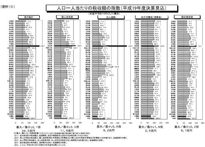 同時に、資料10をご覧いただきますと、その際には、一つには税収が安定的であること、そして偏在性が小さい地方税体系をつくっていくという課題がございます。ここは、人口一人当たりで税収の偏在度を比べておりますけれども、ご覧いただきますように、真ん中にあります法人二税、これは非常に大都市に集中しやすい構造がございます。一方では、地方消費税、これは、消費というのは、それほど地域によって大きな差はありませんので、非常に偏在性の小さい税であるということが見てとれます。